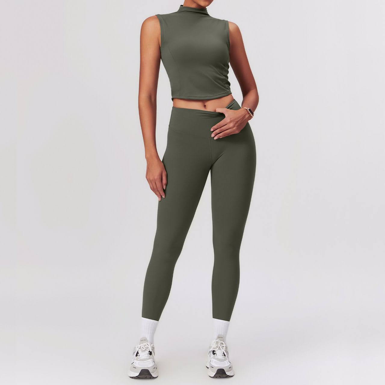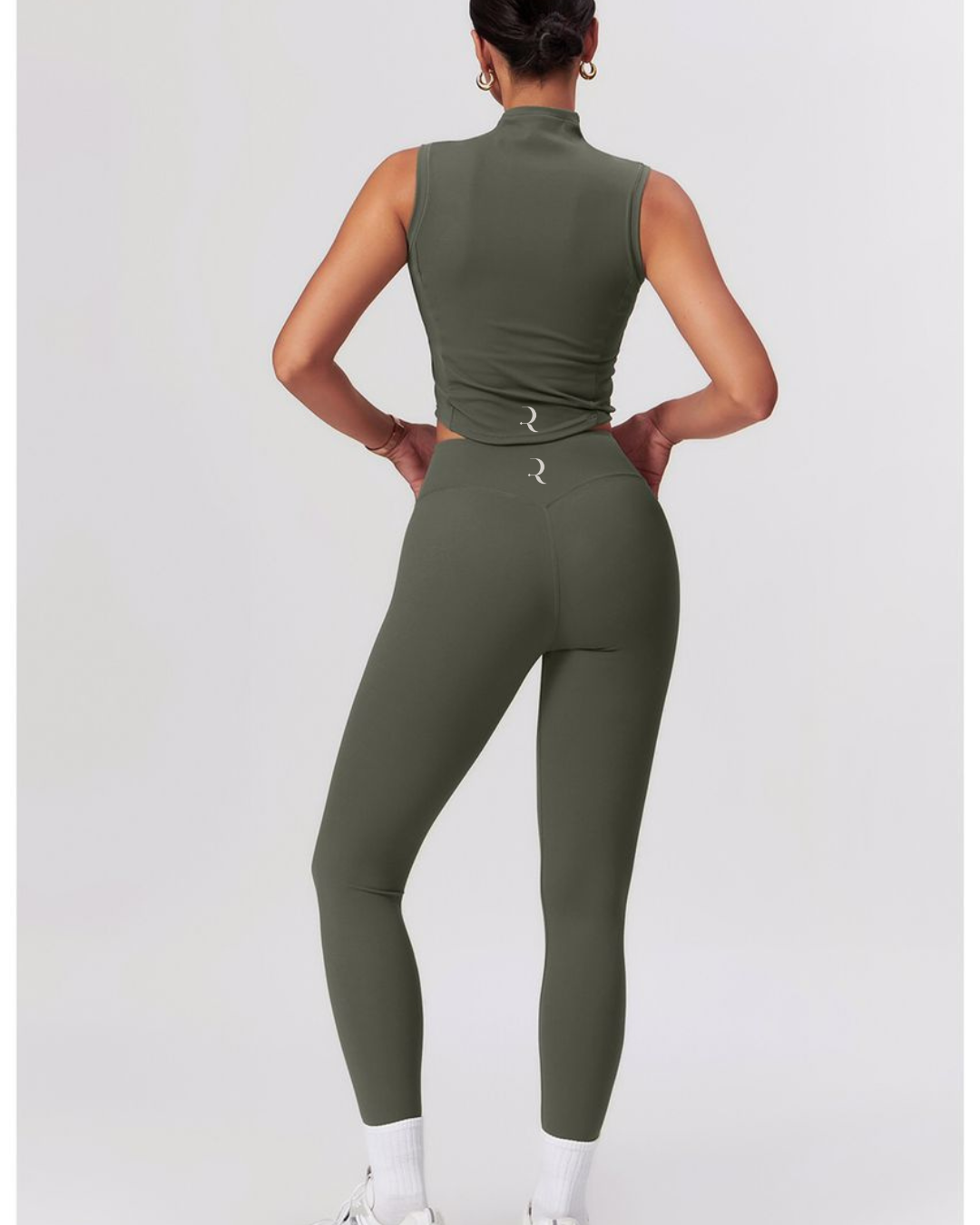 Elevate your basics with the Kaizen Set. This sophisticated ensemble in deep Olive Green features a sleek mock-neck crop top with removable padding for essential support and a flattering shape. Paired with our high-waist, sculpting leggings, this set is the definition of powerful, modern minimalism.
