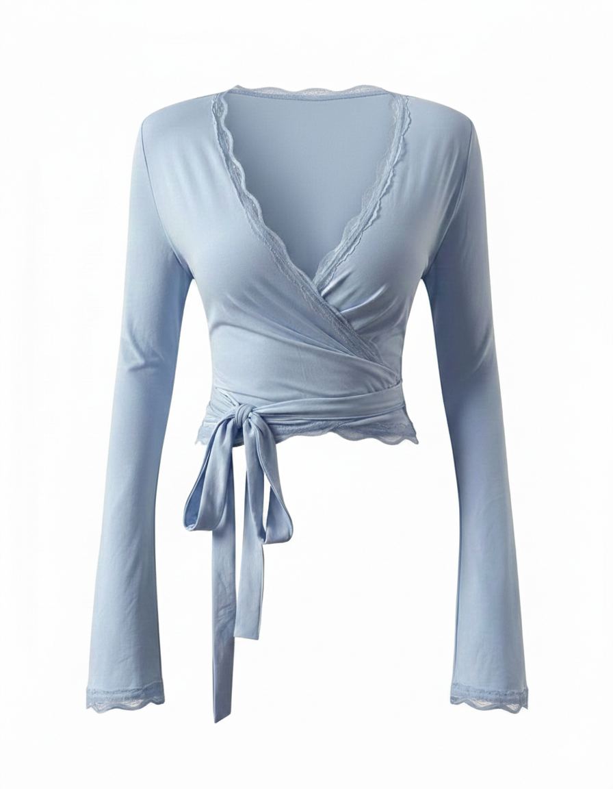 A refined wrap silhouette elevated with delicate lace detailing. Crafted from soft stretch fabric, this long-sleeve top gently contours the body while the adjustable waist tie creates a flattering, feminine shape. Designed for effortless versatility, it moves seamlessly from daywear to elevated styling.