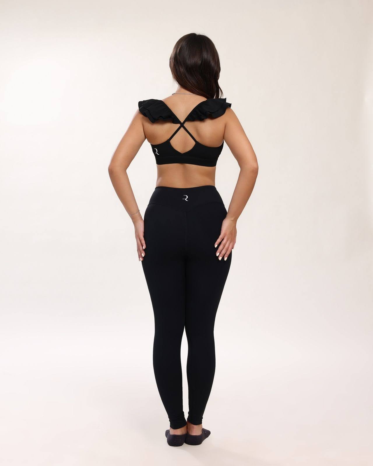 The ultimate little black set, reimagined. This stylish ensemble features a comfortable, supportive bra framed by adorable flutter ruffles on the shoulders. Paired with our buttery-soft, High-Rise Leggings for a sleek, sculpted look. It’s activewear that makes you feel instantly put-together.