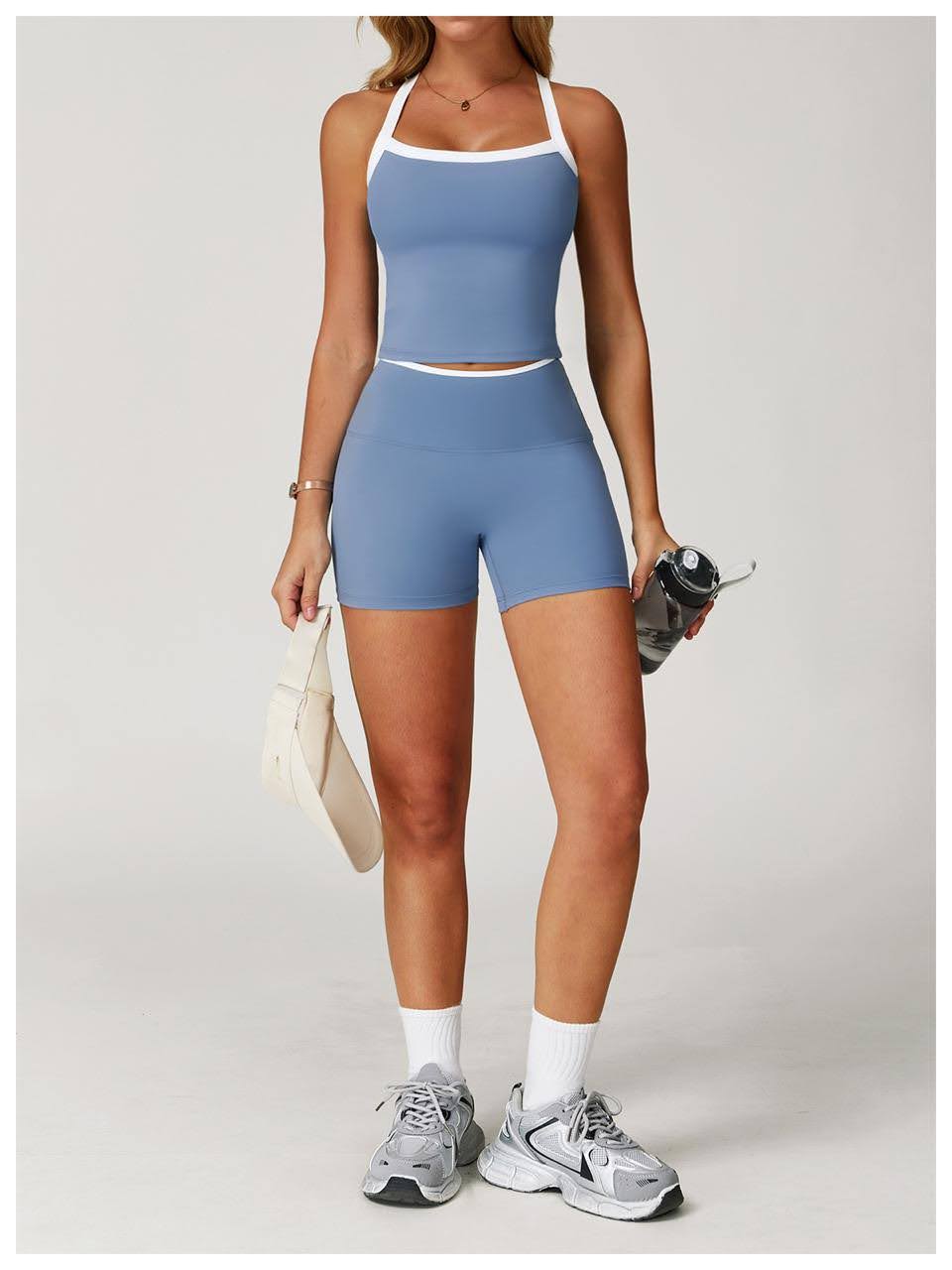 Your essential set for warm-weather workouts. Featuring a striking Sky Blue and white contrast trim design, this outfit is built for comfort and speed. The longline bra top offers secure coverage, and the high-waist sculpting shorts ensure a confident, cooling fit. Get ready to move!